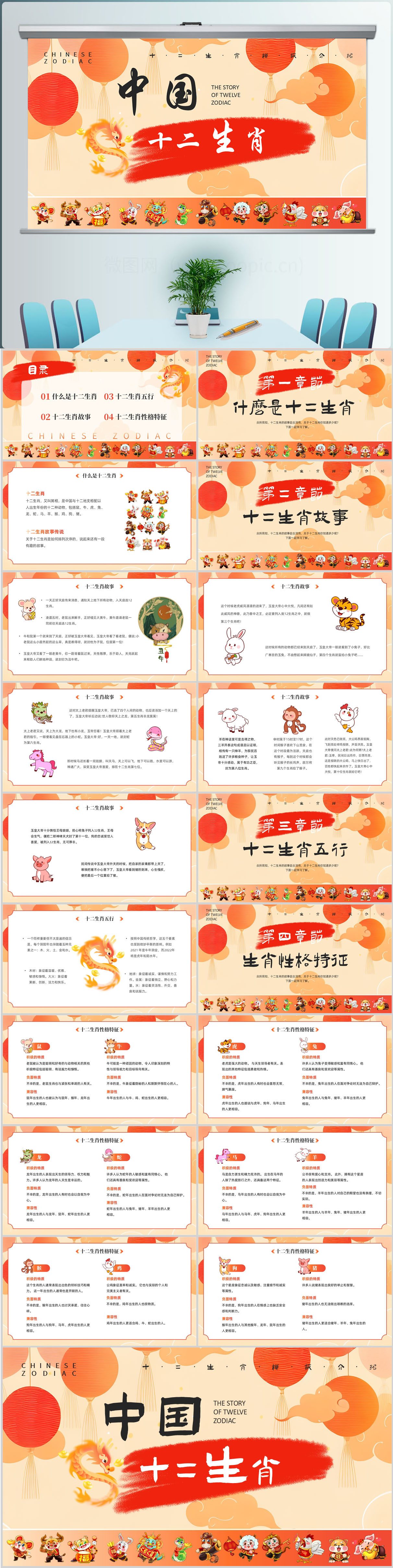 国潮风十二生肖传主题统文化通用PPT模板