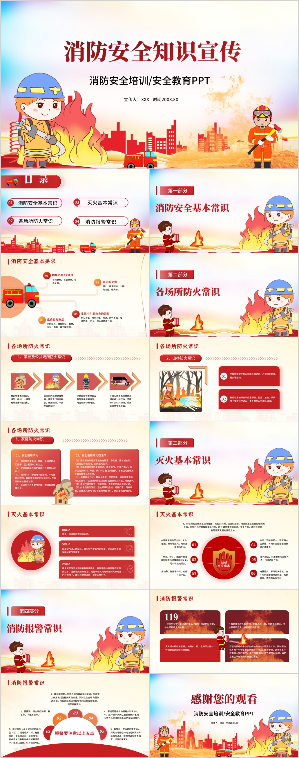 红色卡通119消防安全知识宣传教育主题课件PPT模板