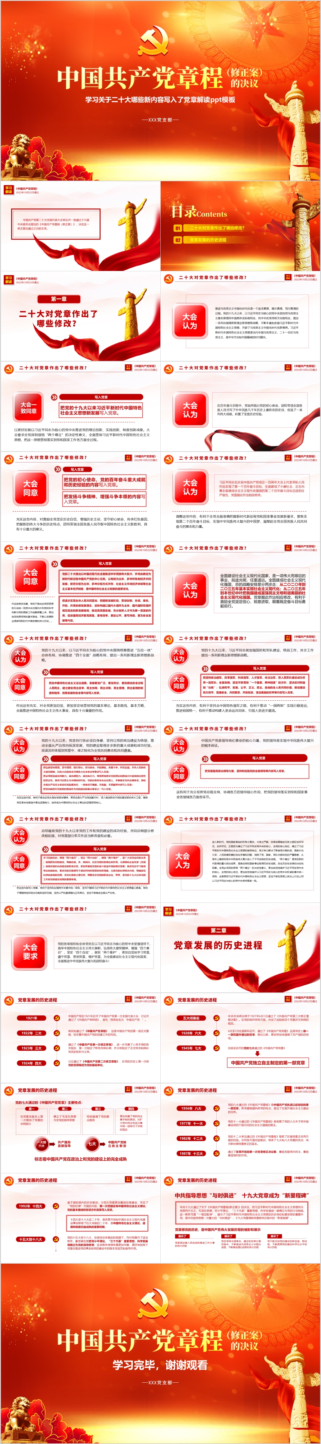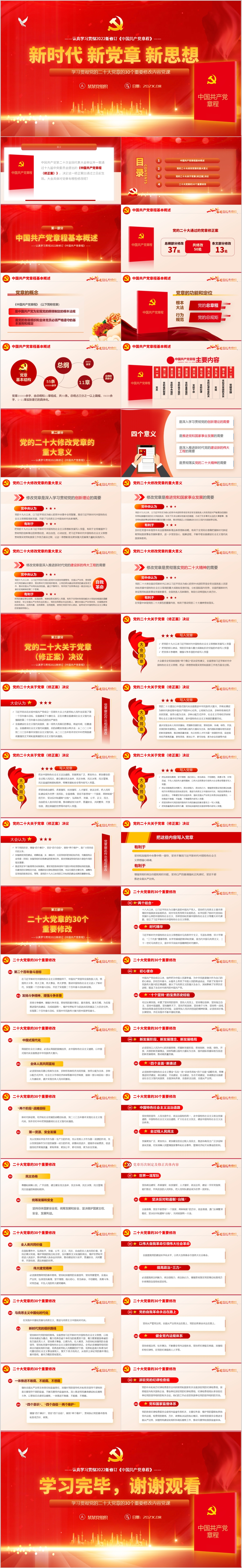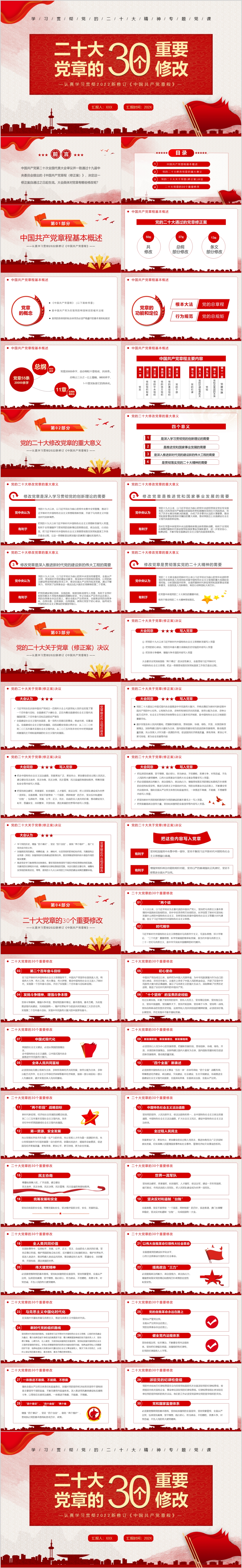 红色二十大党章的30个重要修改内容学习党课PPT模板(内含word演讲稿)