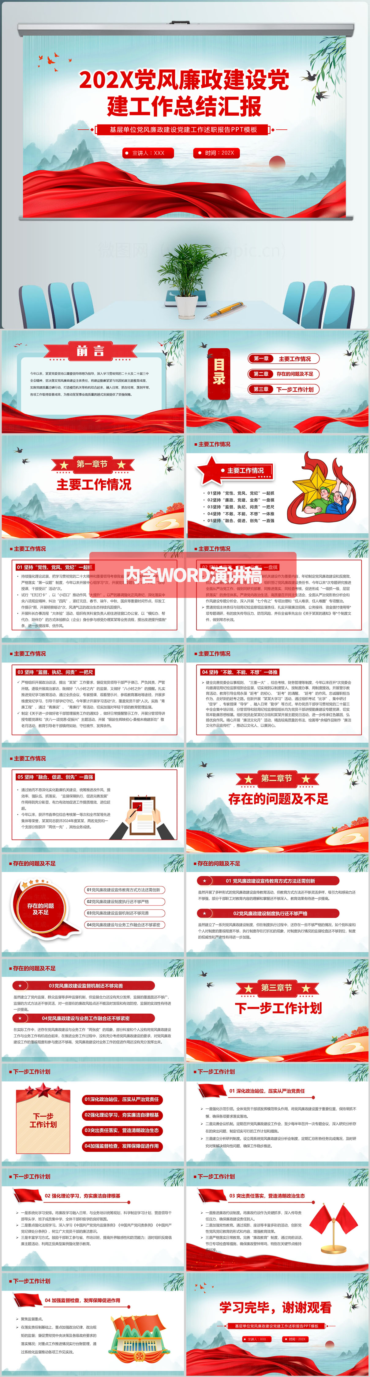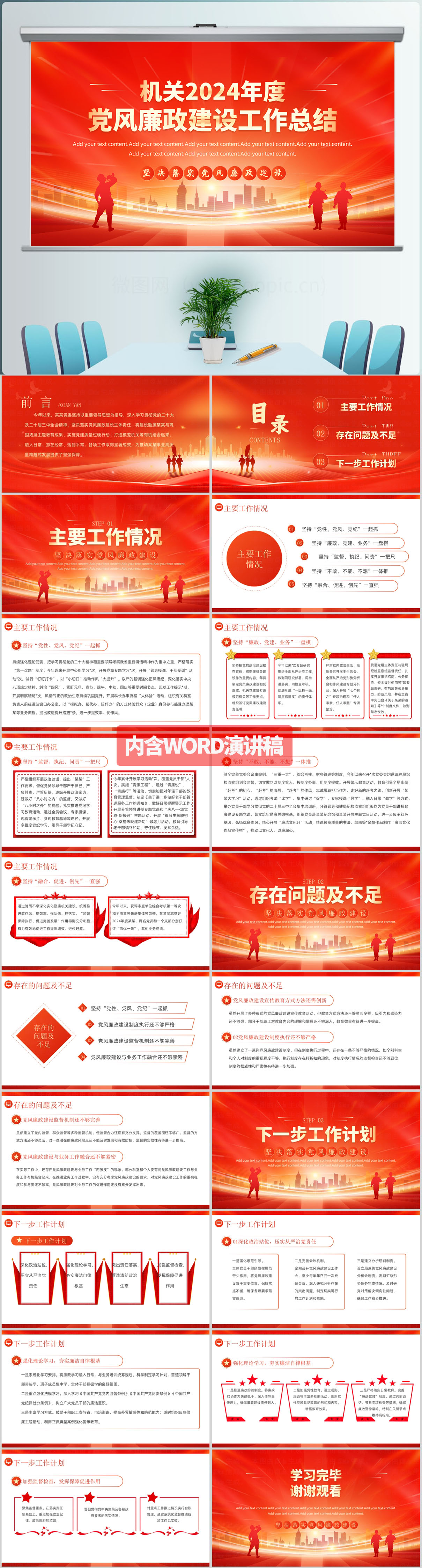 2024红色机关年度党风廉政建设工作总结PPT模板(内含WORD演讲稿)