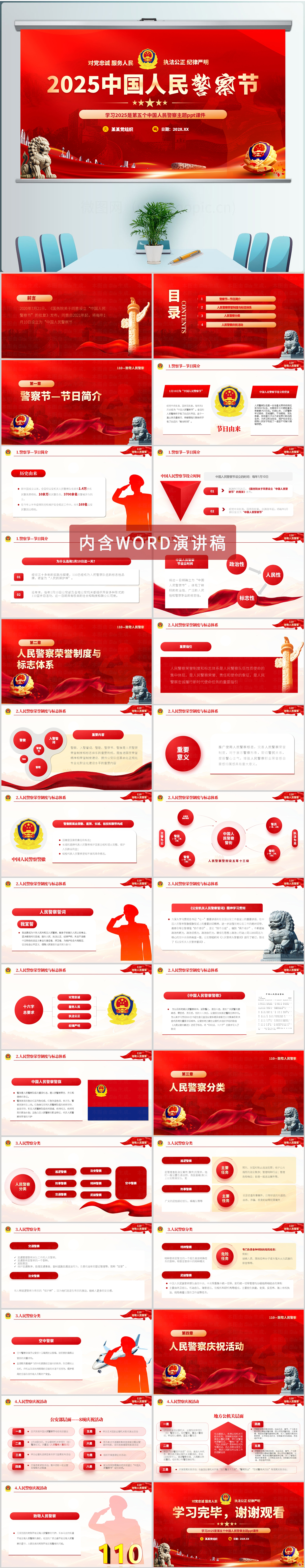 红色大气2025全国110宣传日中国人民警察节党课学习ppt模板(内含WORD演讲稿)
