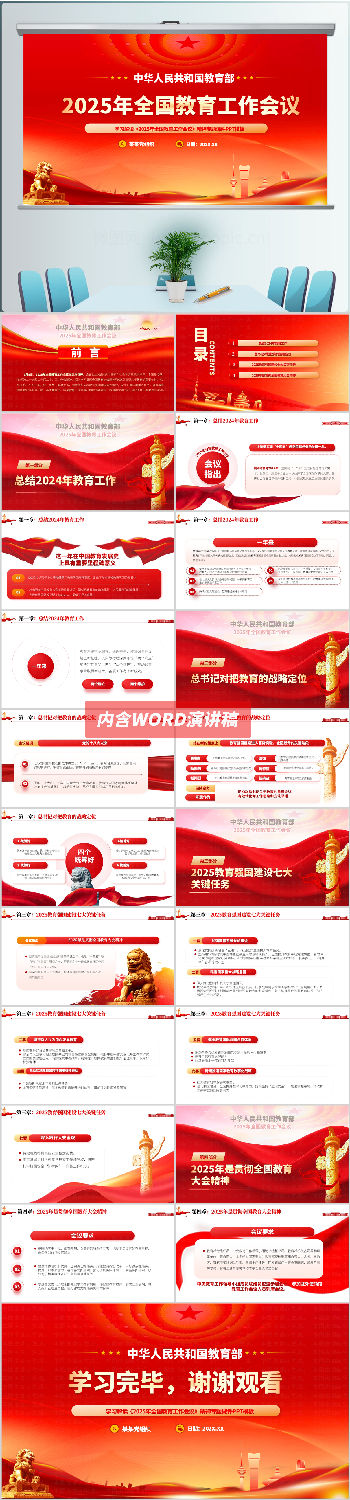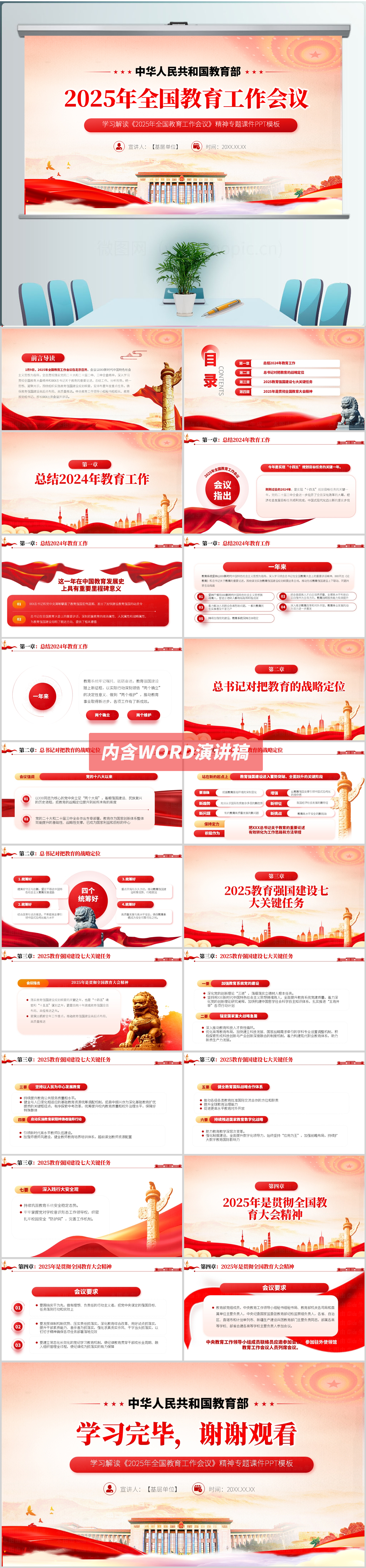 红色大气2025年全国教育工作会议解读ppt模板(内含WORD演讲稿)
