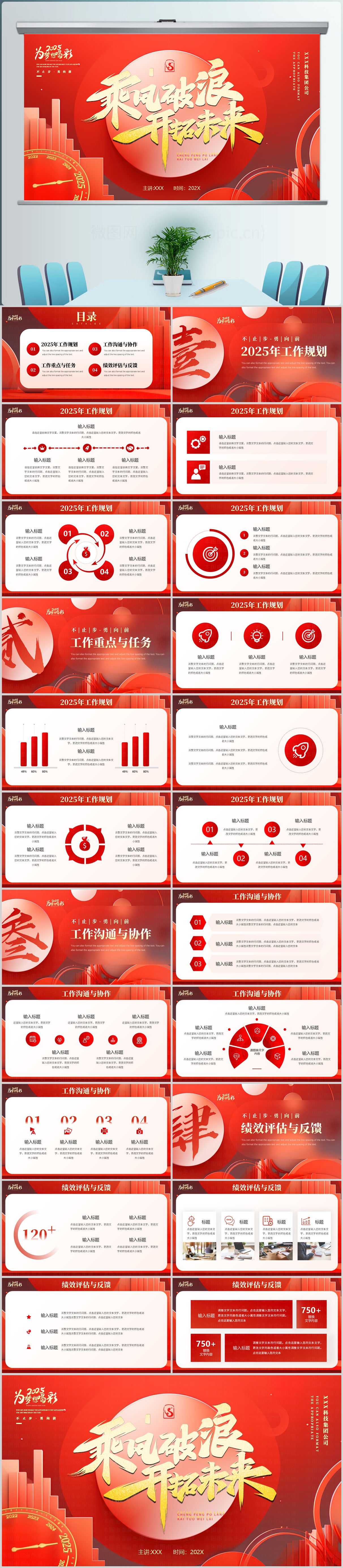 红金商务风乘风破浪2025开年工作计划PPT模板设计
