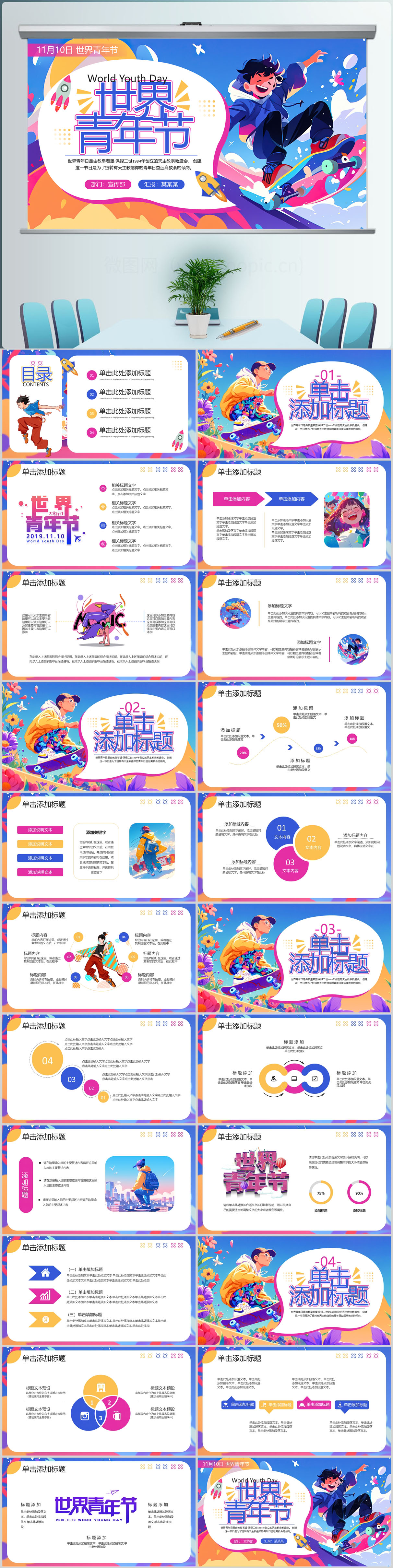 蓝色卡通风世界青年节PPT模板设计