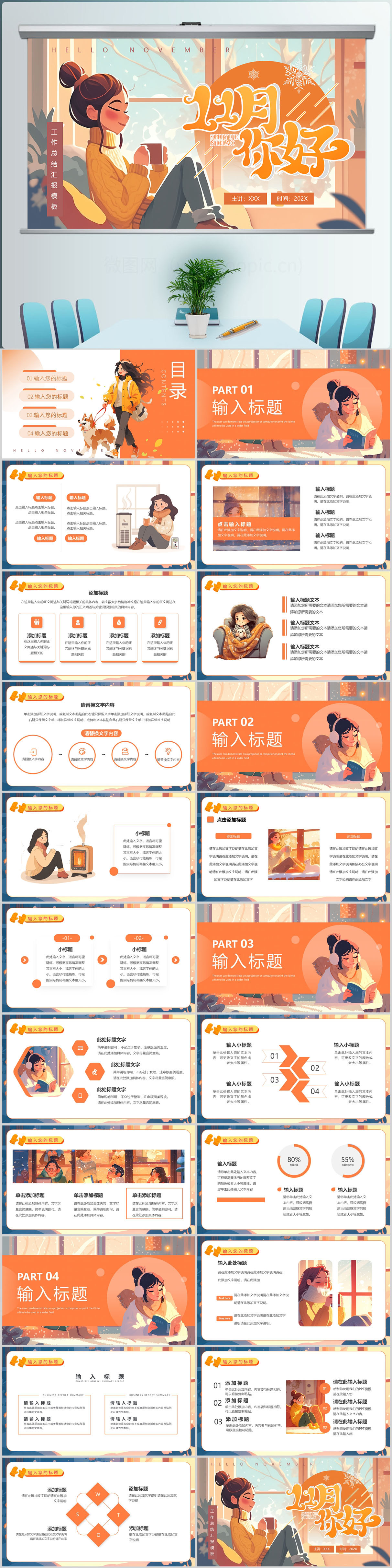 黄色小清新11月你好工作汇报ppt模板设计