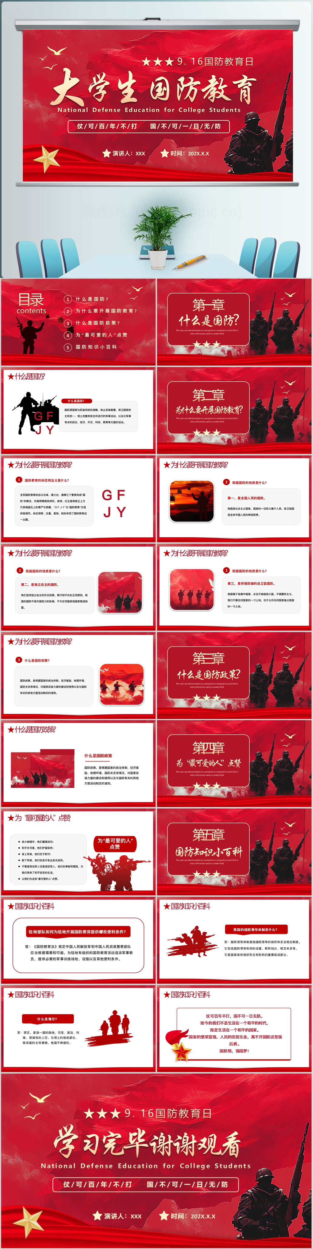 红色大气9.16大学生国防教育日宣传主题教育党课ppt模板