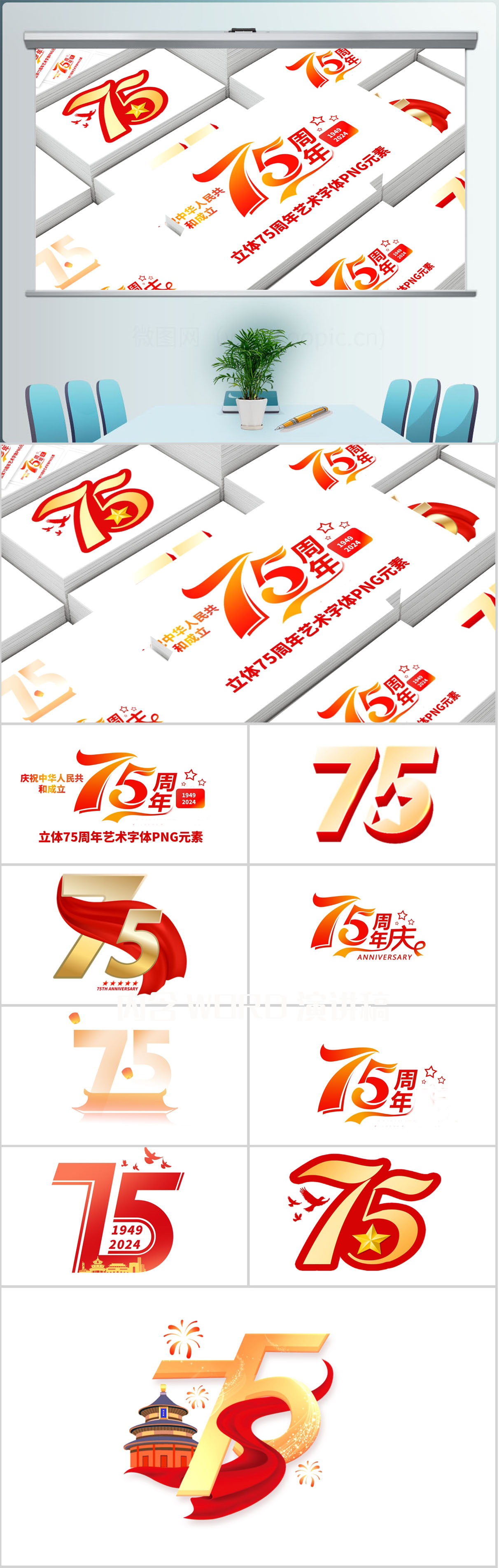 2024十一国庆节3D立体75周年艺术字体PNG元素设计