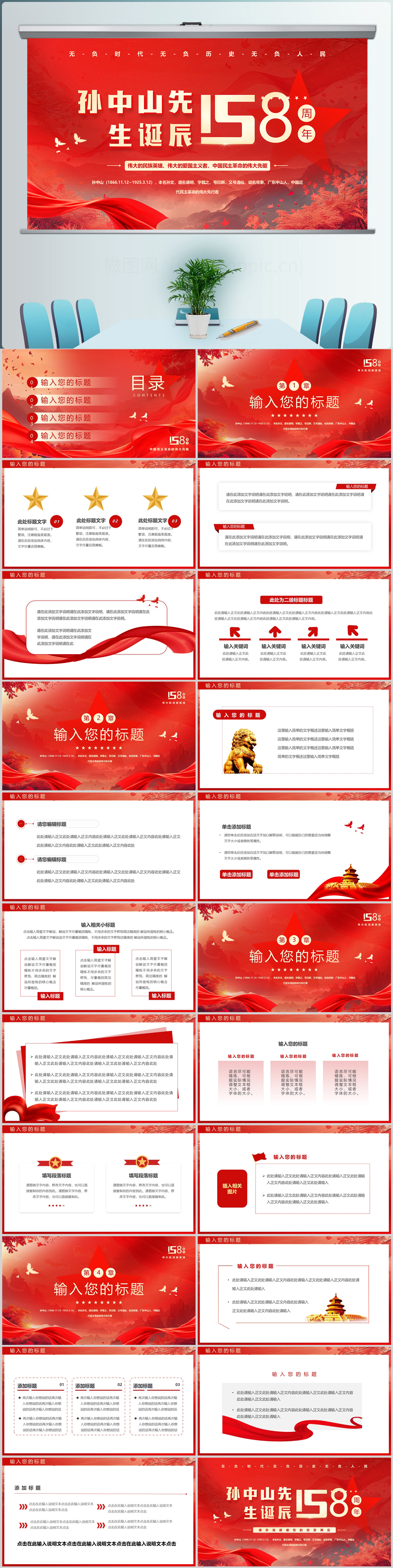 红色孙中山先生诞辰158周年纪念日主题课件ppt模板