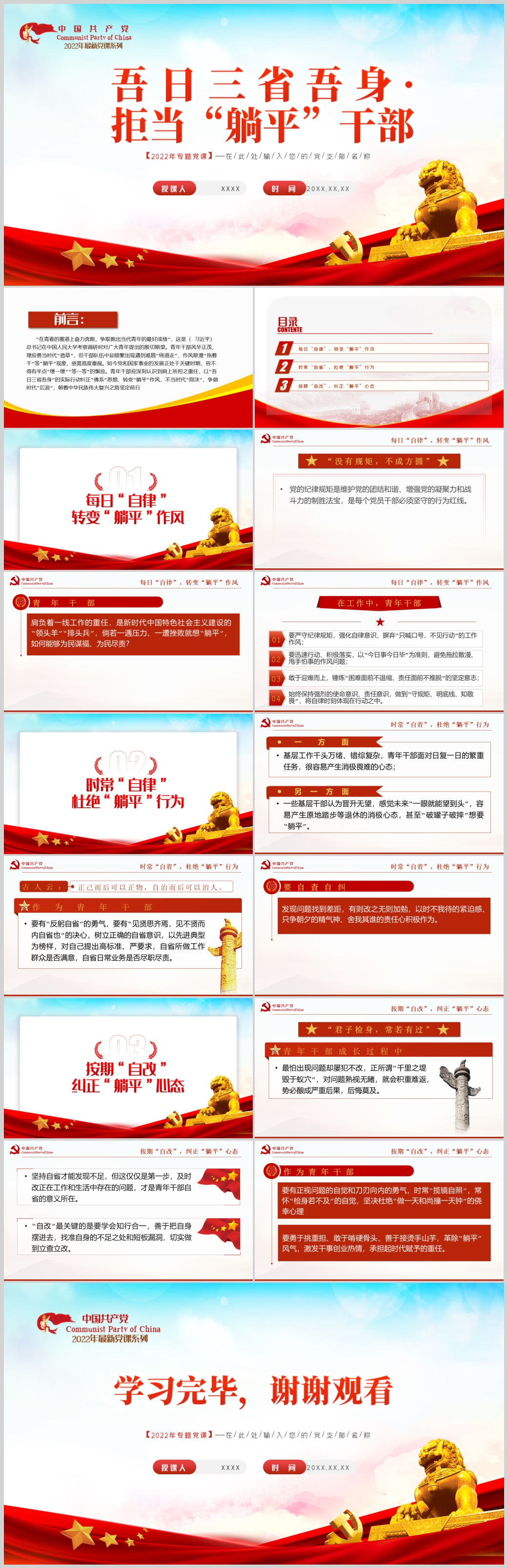 2022年吾日三省吾身拒当躺平干部党员干部自律教育党课PPT模板(内含WORD演讲稿