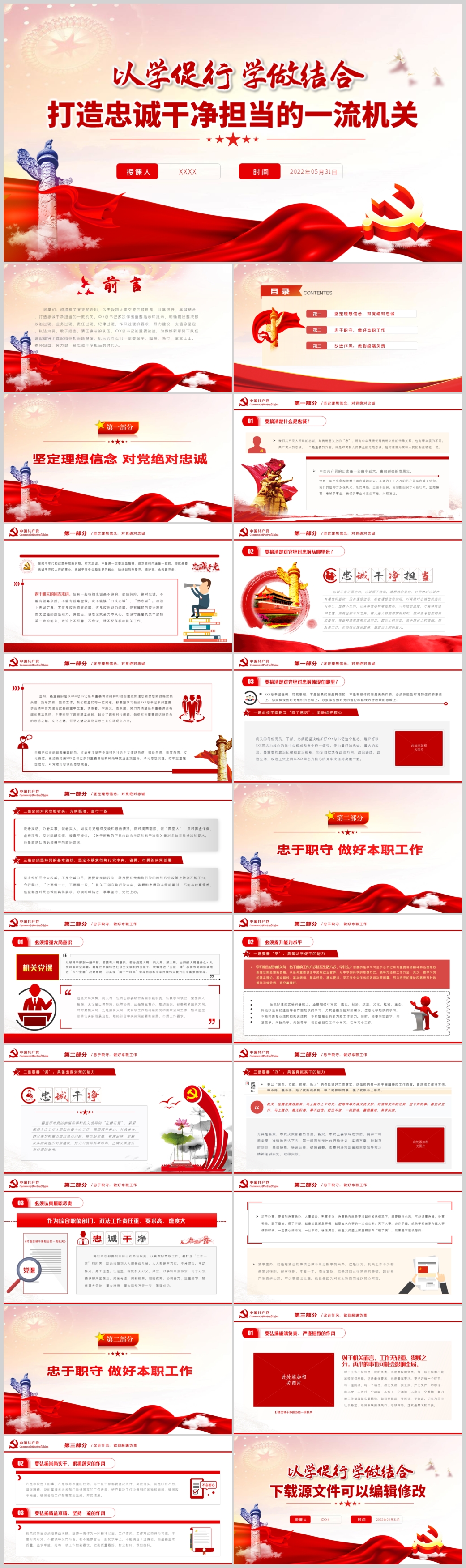 2022年以学促行打造忠诚干净担当的一流机关党课PPT模板(内含WORD演讲稿)