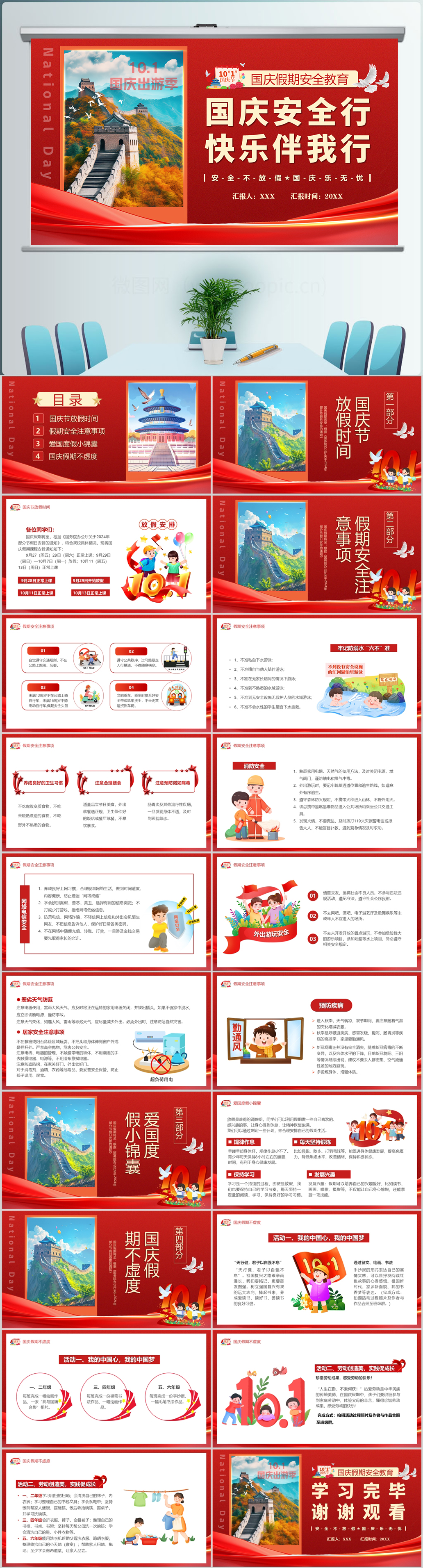 2024年插画风10.1国庆黄金周假期安全教育主题班会ppt模板