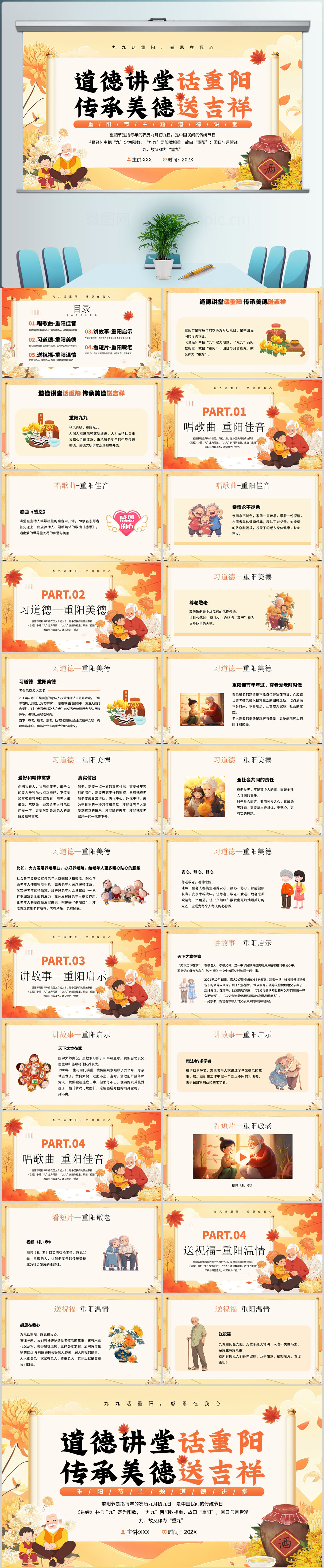 卡通风中国传统节日九九重阳节感恩在我心主题班会课件PPT模板
