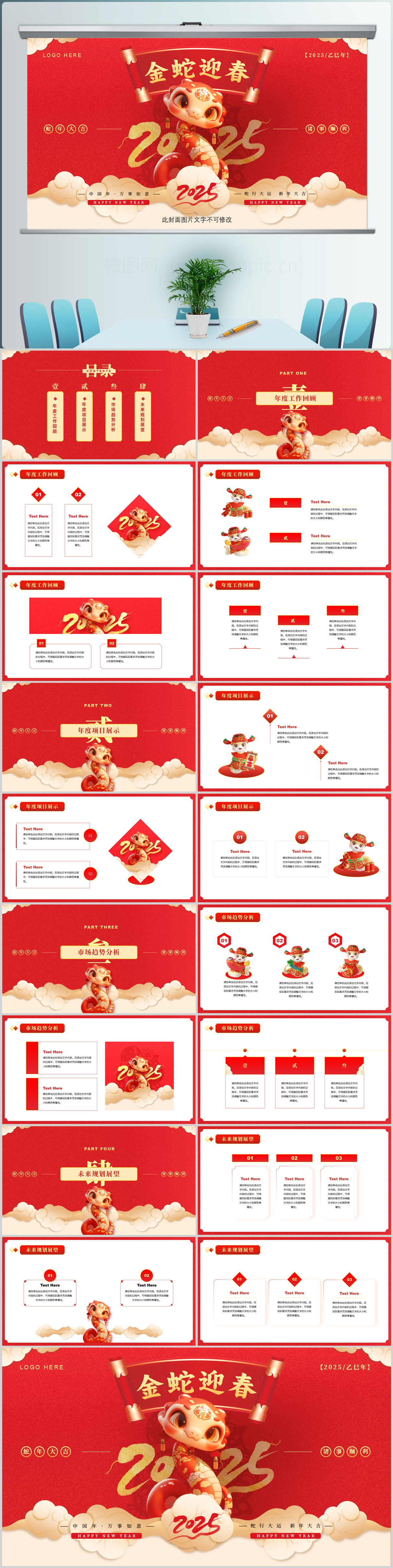 红色喜庆蛇年迎春2025新年通用工作总结计划ppt模板