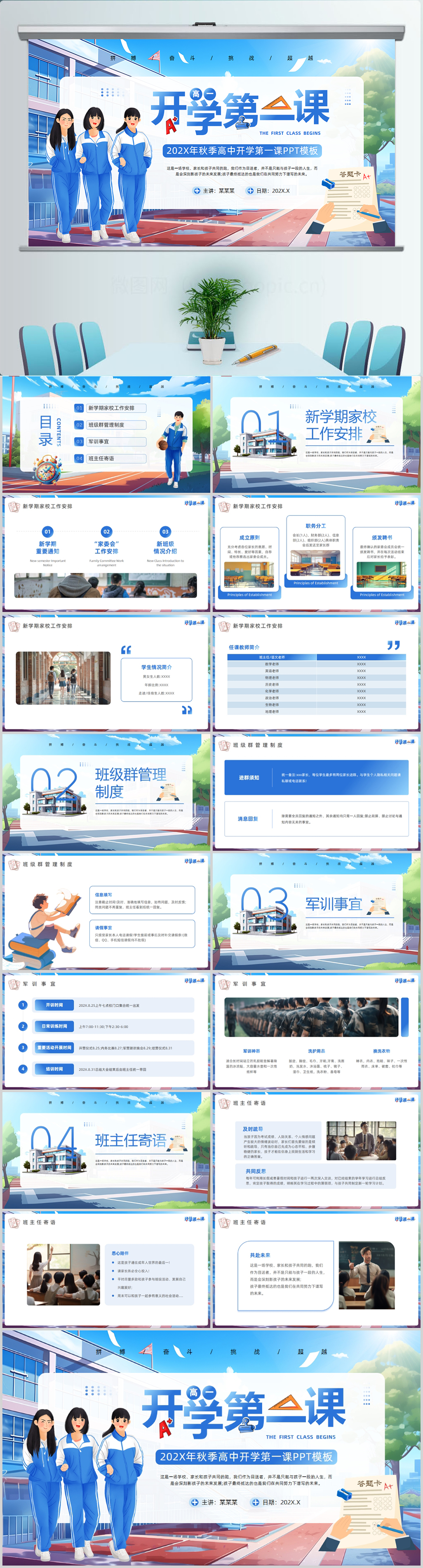简约蓝色高中学校开学季开学第一课班会课件PPT模板设计