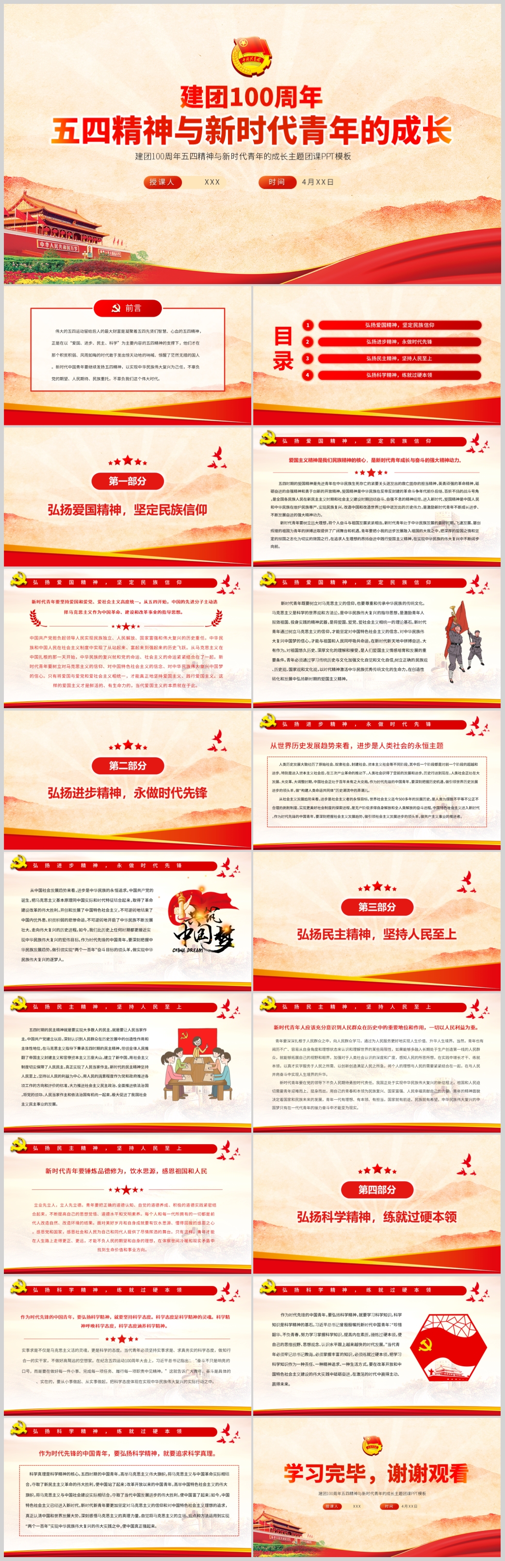 五四精神与新时代青年的成长共青团100周年PPT模板(内含WORD演讲稿)