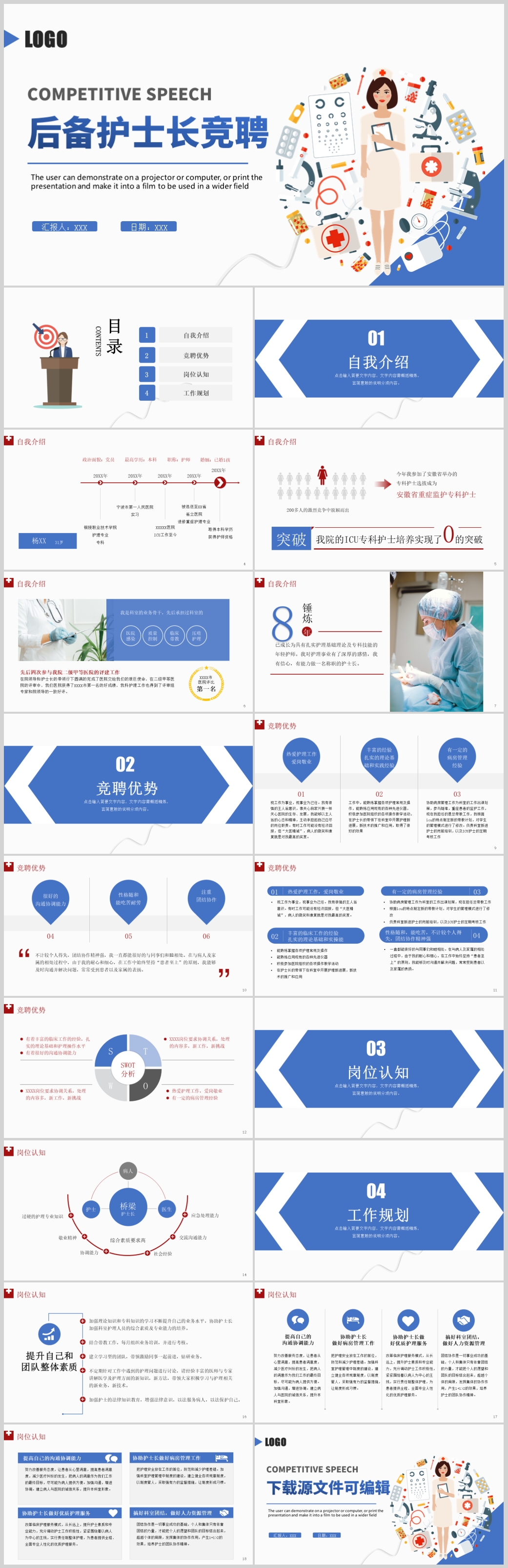 蓝色卡通护士长岗位后备护士长竞聘PPT模板