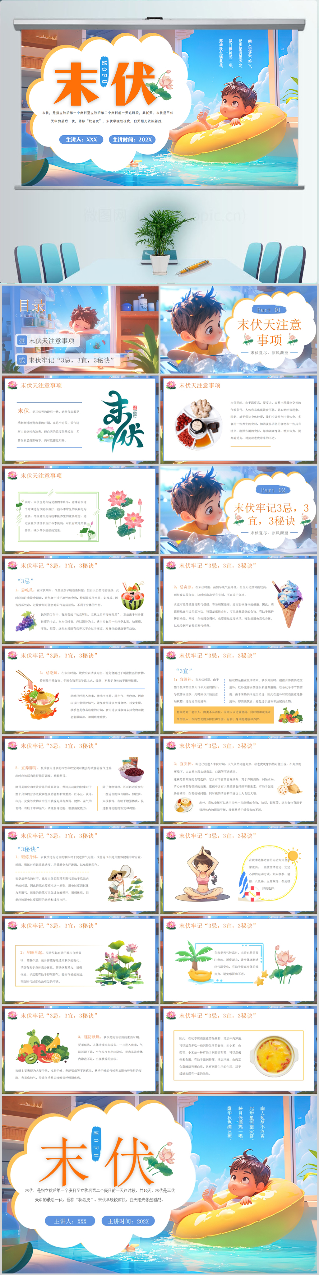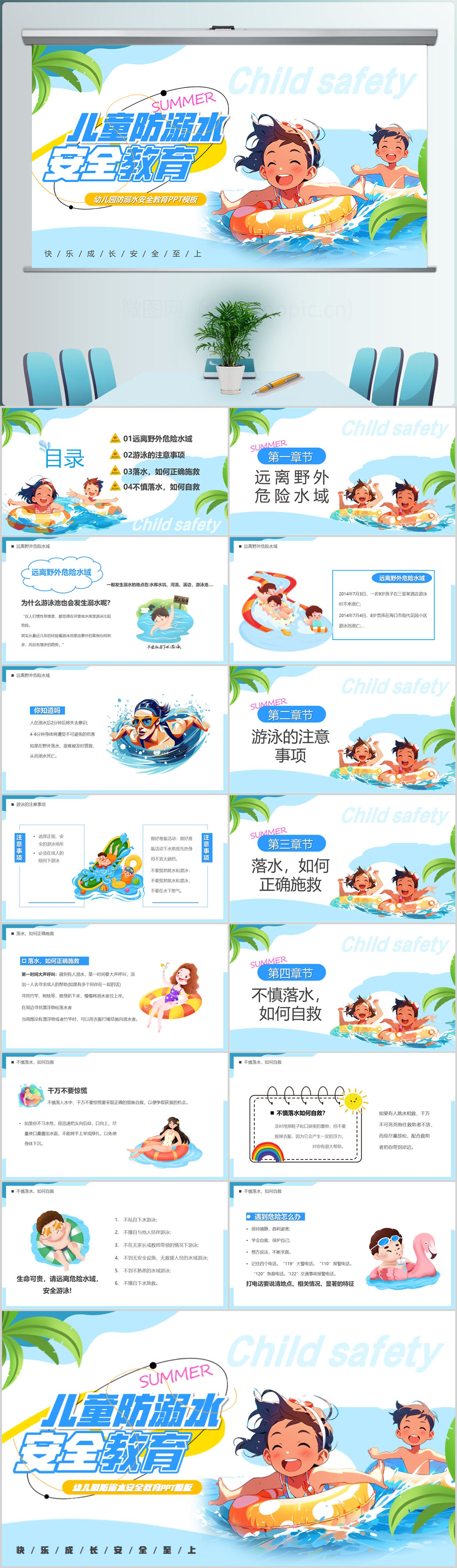 卡通幼儿园防溺水暑假安全教育班会主题PPT模板