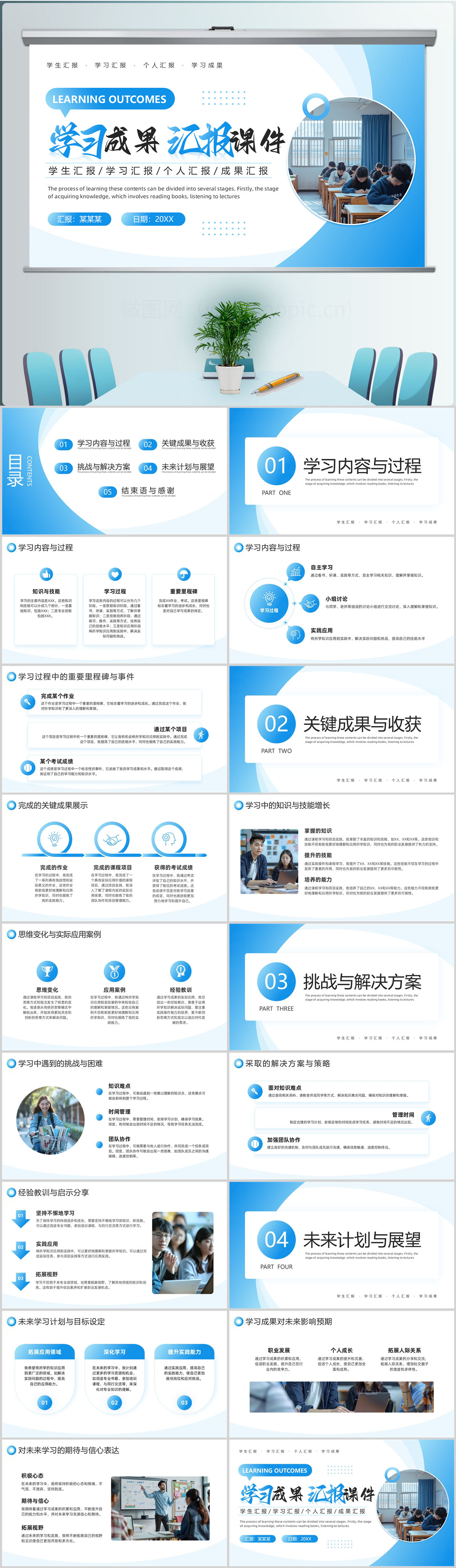 蓝色简约风学习成果汇报总结计划PPT模板