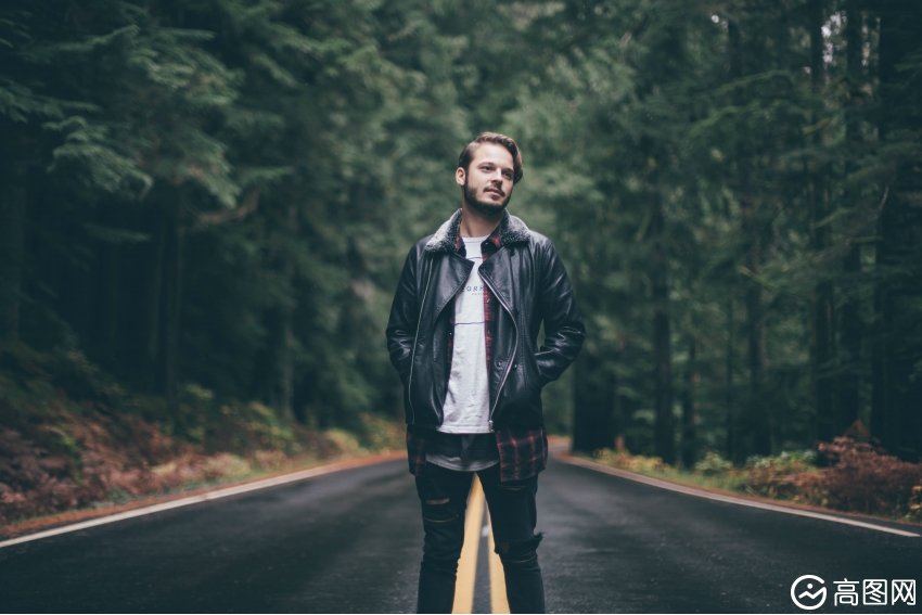 > 男子 道路 森林 松树 沥青 公路 黑色皮夹克 皮革