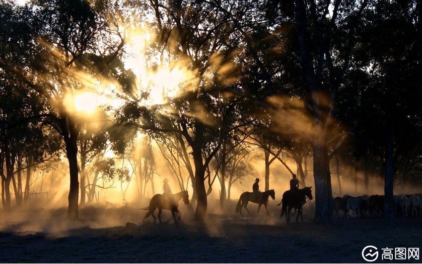 > 牛仔 阳光 树 羊群效应 马匹 骑马 尘土飞扬 农村 牧场 农业 生活方式